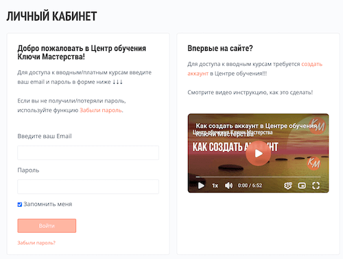 3. Зайдите на сайт Центра Обучения Ключи Мастерства. Перейдите в Личный кабинет. В форме для входа ведите ваш логин и пароль.