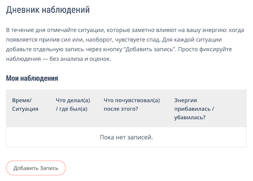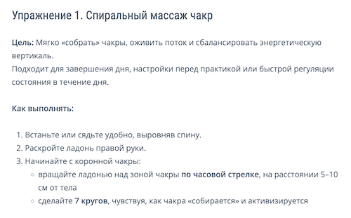 На каждом этапе курса вы сразу переходите к применению знаний на практике. Все задания построены так, чтобы вы могли отслеживать свои состояния, работать с энергией осознанно и постепенно развивать свои навыки саморегуляции.